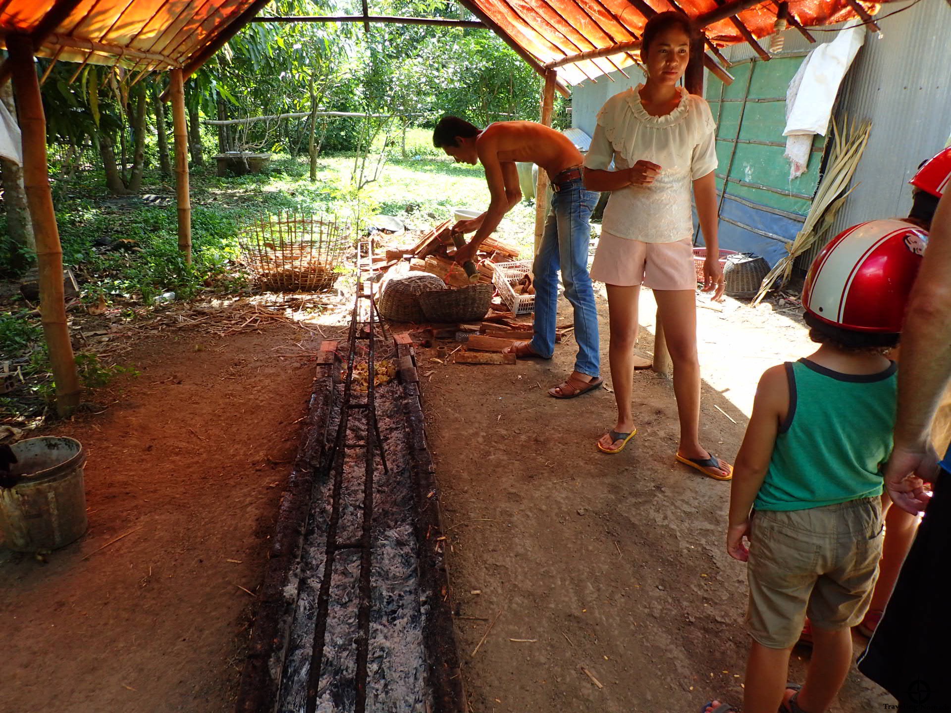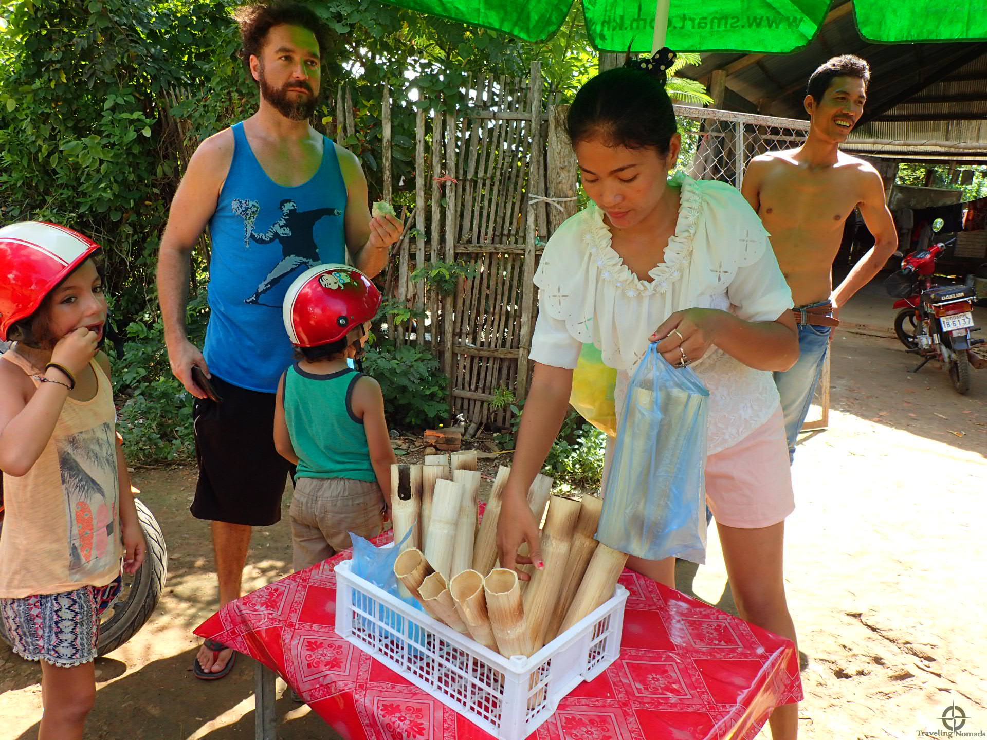Hicimos una parada para comprar Kralan, miam, la merienda favorita de los Khmers. La pareja que los vendía se alegró tanto de vernos por los parajes que decidieron mostrarnos la preparación del kralan en su casa. Como en Krakor ya habíamos jugado a “no-entiendo-nada-aún-si-sigues-hablando-en-Khmers”, estábamos listos para cualquier cosa. Así, entendimos que el kralan se hace con arroz pegajoso, con leche de coco, azúcar de palma y frijoles negros. Esto se cocina sobre un horno de ladrillos y con carbón y se asa dentro de un palo de bambú … man … we are hot.