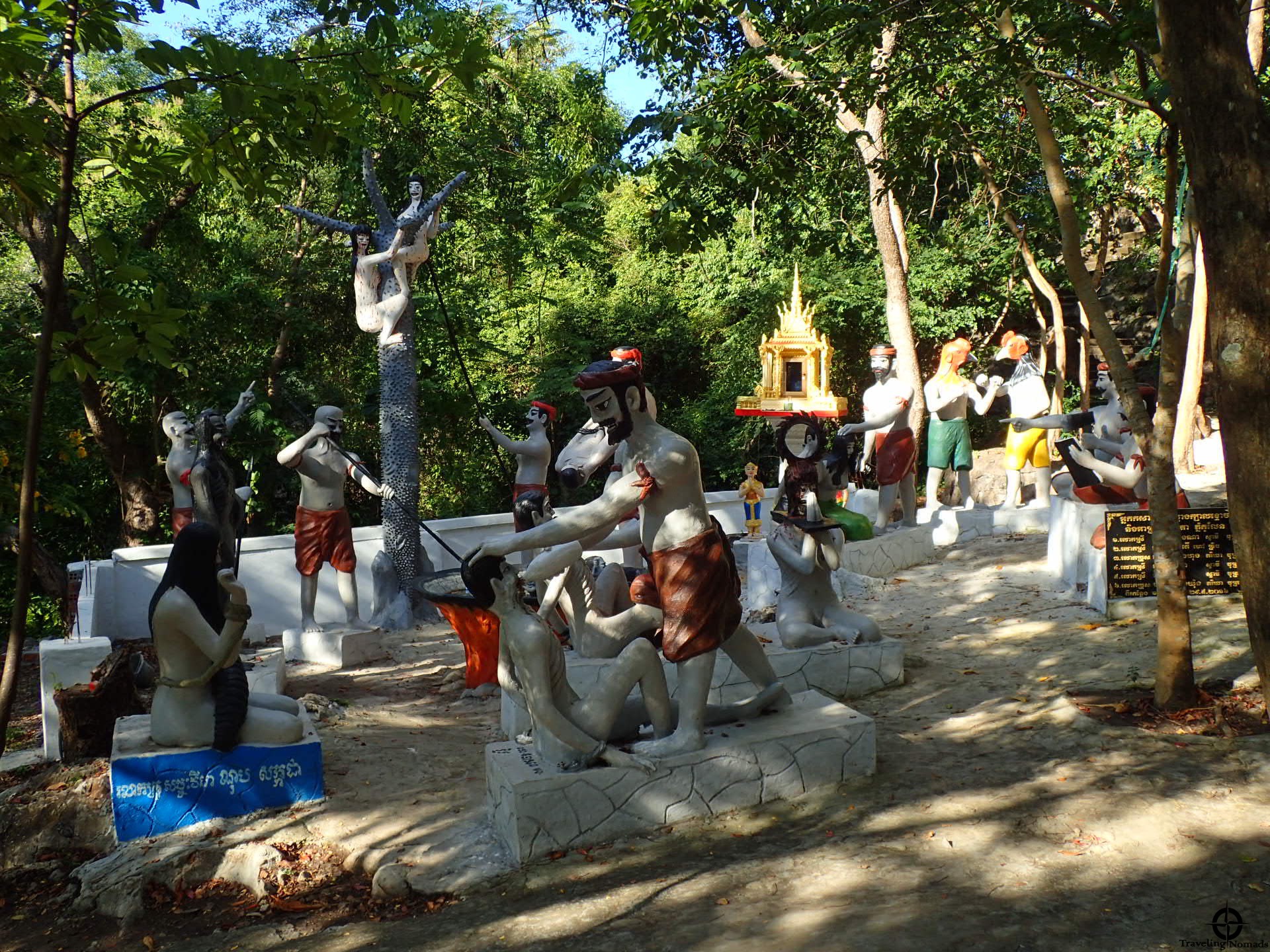 No, no subimos los 700 escalones para llegar a la cima de la colina. Tomamos un moto-taxi en la entrada del sitio y oramos para que el conductor disfrazado de flash-peligro-motorizado le diera un poquito más al freno. Después de haber sobrevivido, nos dirigimos a los “campos de la muerte”. En el sitio, un Wat, mmmm … otro Buda enorme, varias esculturas representando las torturas experimentadas (en el mismo lugar) por el pueblo durante el gobierno del crazy Pol Pot y las dos cuevas cuyos pozos se utilizaron para lanzar a la pobre gente después de haberlas torturado.
