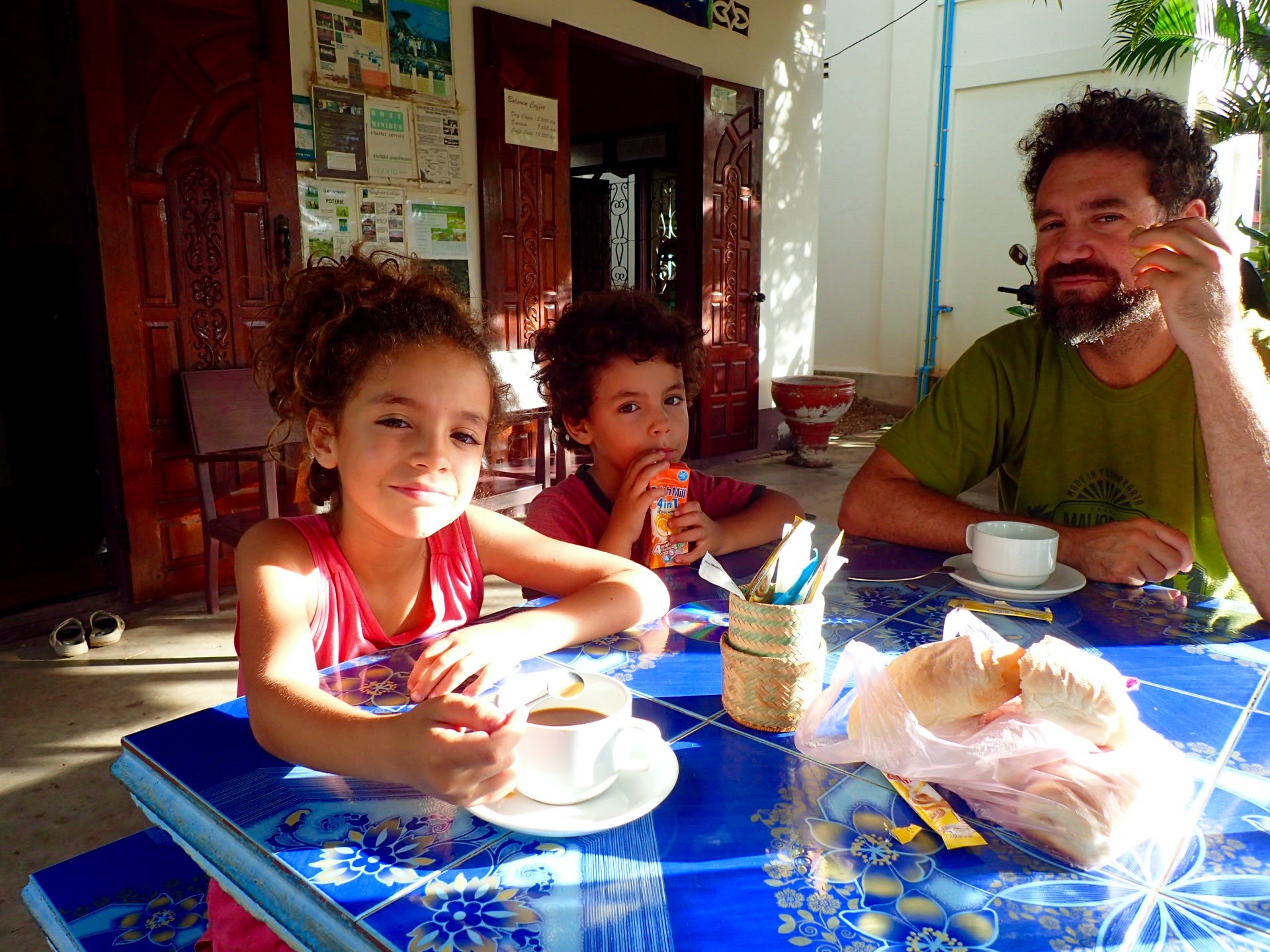 Bon, nous avons profité de l’ambiance du village et de ses gens pour envoyer des Sabaï dii, pour se faire faire un sarong sur mesure dans le seul atelier de couture de la place, pour visiter ses wats, pour se faire prendre en photos avec des ados qui n’avaient jamais touché des cheveux frisés et pour se faire inviter à une présentation au théâtre d’ombres à laquelle nous n’avons pas assisté comme c’était trop tard pour les enfants.