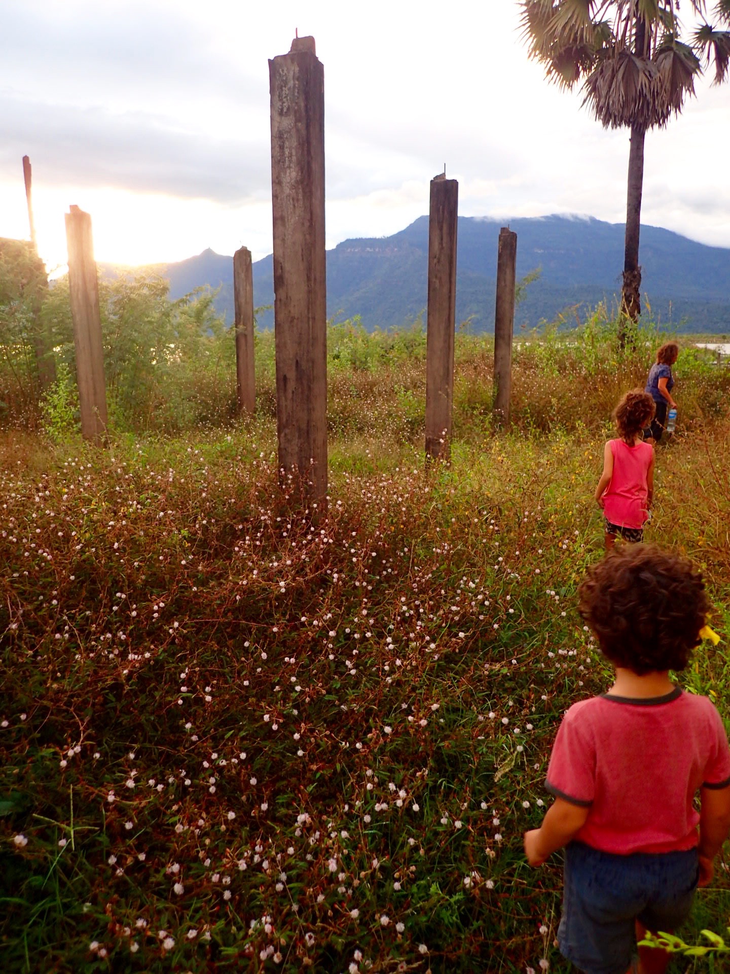 Nous étions prêts à nous faire pousser des dreadlocks et à nous baigner tous nus aux 4000 îles (Si Phan Don), voire dans les eaux entourant l’île de Don Khon, quand la pluie gâcha nos plans. Comme le moment du départ arrivait, nous nous sommes mis à demander le chemin pour nous rendre à notre prochaine destination, Champasak. Voici un aperçu des questionnements des foules : “Mais, pourquoi vous allez dormir là, personne ne reste là ?”, “il n’y a rien à faire dans ce village”, “Tout le monde va à Pakse et de là vous prenez un tour, mini-van ou moto pour aller une 1/2 journée au Wat Phu de Champasak”, “Vous avez des enfants, blablabla”. Ah oui?, CHALLENGE ACCEPTED!