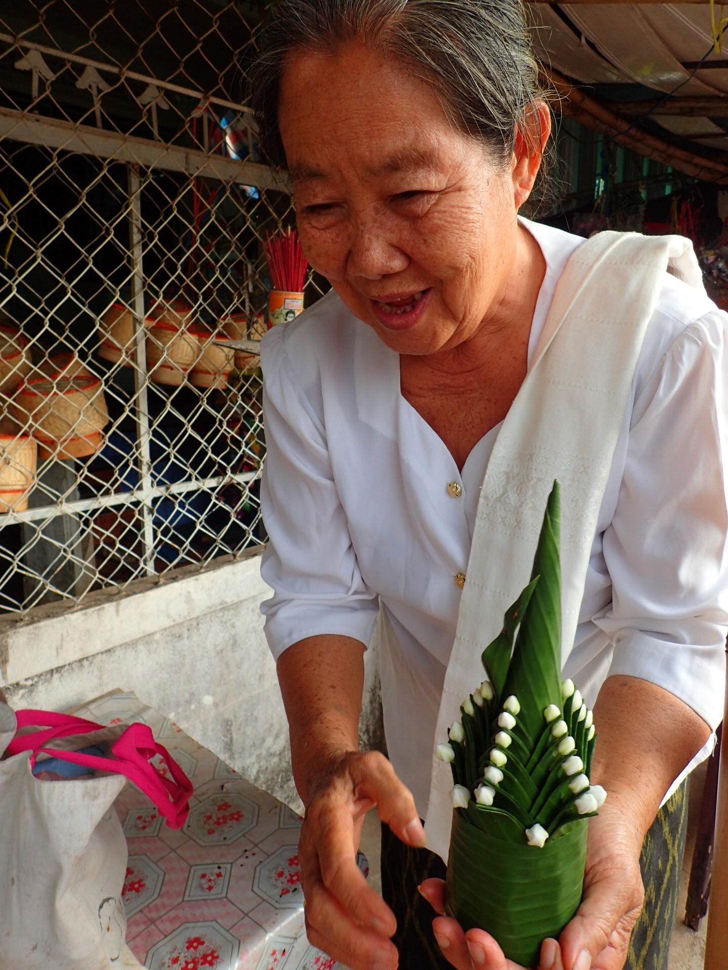 Il y a quelques restaurants pour les touristes à Champasak, mais si vous préférez, vous pouvez manger la salade khmer préparée par la grand-maman qui vend des sacs de chips (il y en a quelques-unes). Nous avons repéré son mortier et avons fait des pieds et des mains pour qu’elle comprenne que nous voulions manger le repas qu’elle vendait en take-out aux locaux. Oh Lord, ce fut difficile, mais la récompense fût un délice, digne d’un restaurant cinq étoiles.